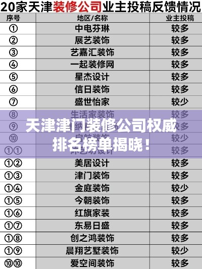 天津,这座充满现代气息与历史底蕴的城市,吸引了众多装修公司在此扎根发展,本文将为您介绍天津津门地区的装修公司排名,旨在帮助您更好地了解这些公司的服务质量和口碑,为您的装修项目选择合适的合作伙伴。