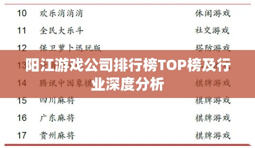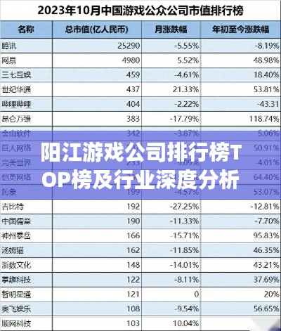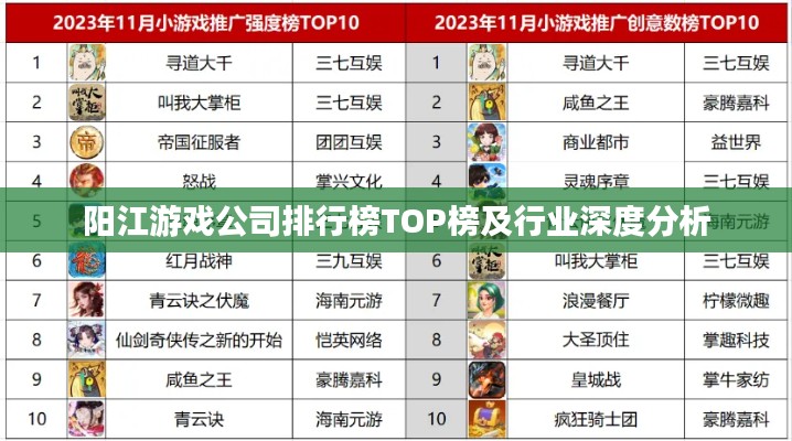 随着全球游戏产业的蓬勃发展,中国游戏市场亦呈现出强劲的增长态势,阳江,作为广东省的一个重要城市,其游戏产业也在逐渐壮大,本文将探讨阳江游戏公司的排名及相关行业情况,以了解该地区游戏产业的发展状况。