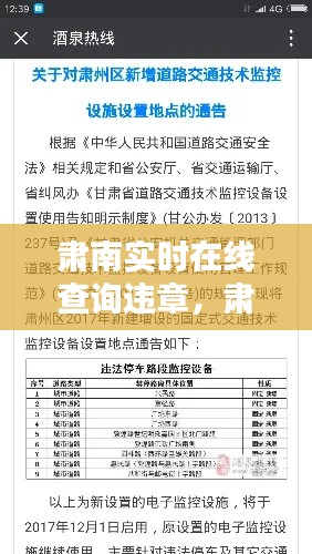 肃南实时在线查询违章是指车主可以通过互联网平台,实时查询自己的车辆违章记录。这项服务由肃南交警部门提供,旨在提高交通管理效率,方便车主及时处理违章,减少交通违法行为。
