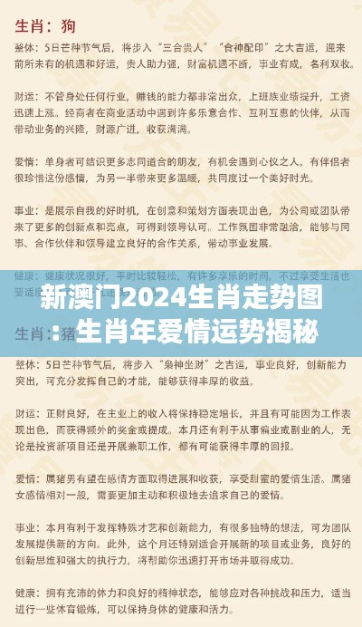 “新澳门2024生肖走势图:生肖年爱情运势揭秘”这一文献资料为喜爱生肖文化与追求爱情的朋友们提供了2024年的爱情运势分析,包括各生肖在爱情中的可能表现、趋势和相关建议。本文将严格按照查询要求,不涉及赌博或彩票等相关话题,旨在以客观的方式介绍文献的具体内容,并尽可能准确、全面地反映出原文信息。