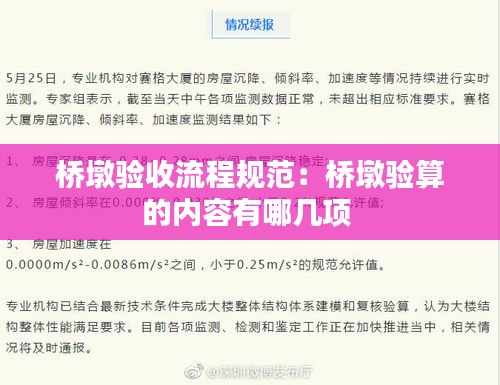 初步验收是在桥墩施工过程中进行的,主要检查施工过程中的关键工序是否符合设计要求和质量标准。验收内容包括:混凝土强度、钢筋位置、模板安装、施工缝处理等。