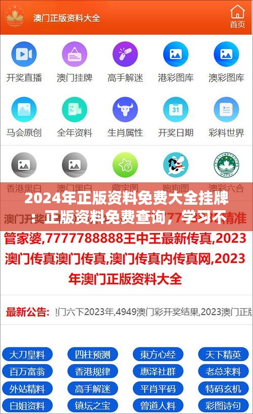 随着数字化时代的到来,越来越多的人开始通过网络平台获取正版资料,以支持创作者和出版社。2024年,正版资料免费大全挂牌成为了一个标志性的进步。这是一个致力于整合各种学术资源的平台,旨在为广大学者、研究人员提供了一个全面、便捷的免费查询渠道。本文将介绍这个平台的具体内容和特点,帮助用户更好地使用这一资源。